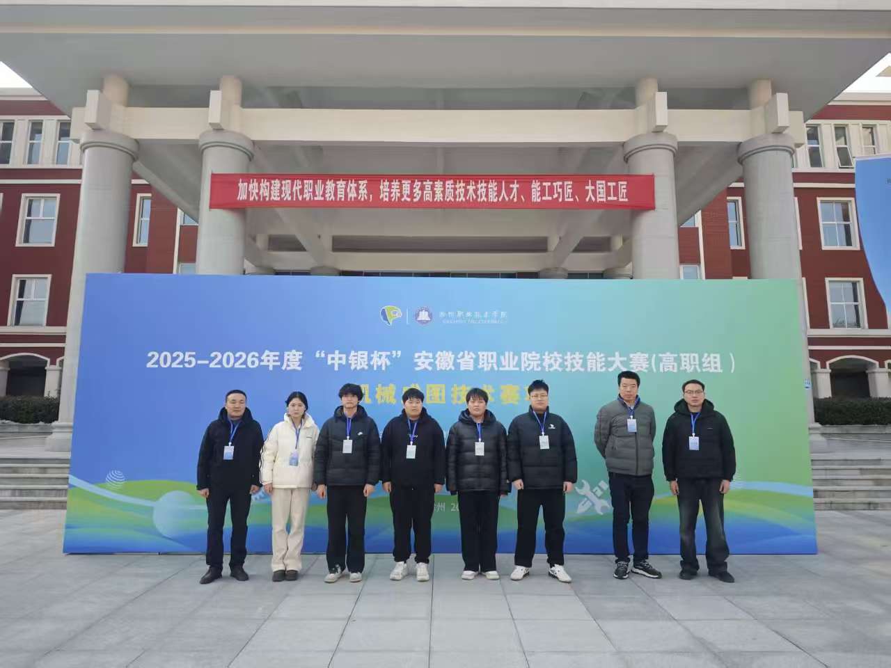近日,2025-2026年“中银杯”安徽省职业院校技能大赛(高职组)机械成图技术赛项在滁州职业技术学院落下帷幕。机电工程学院学子梁宇、陈靖、杨曜隆、陈哲文四名同学组成的2支参赛队伍在沈帅、朱纪铭、黄锟、余晨晨四位老师指导下,凭借过硬的专业技能和默契的团队协作双双荣获三等奖。
