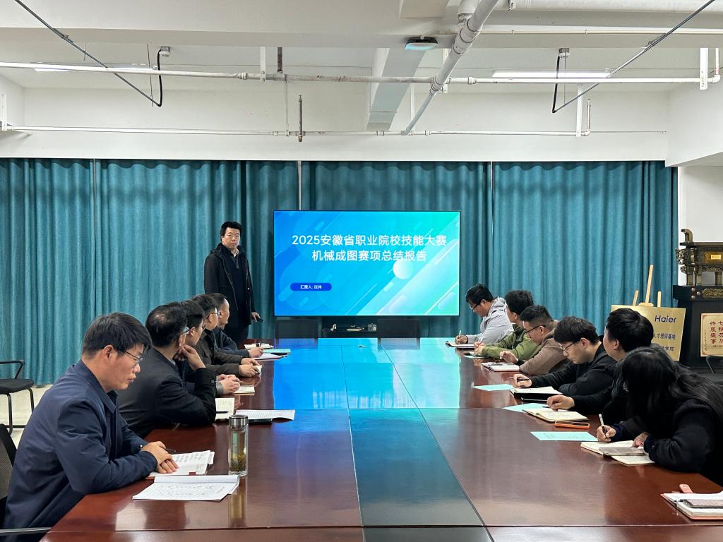 近日,机电工程学院召开2025年安徽省职业院校技能大赛机械成图赛项总结会,全面回顾参赛历程,谋划新一年备赛工作。学院领导班子、指导教师团队参加会议。赛项负责人沈帅老师作专题汇报。