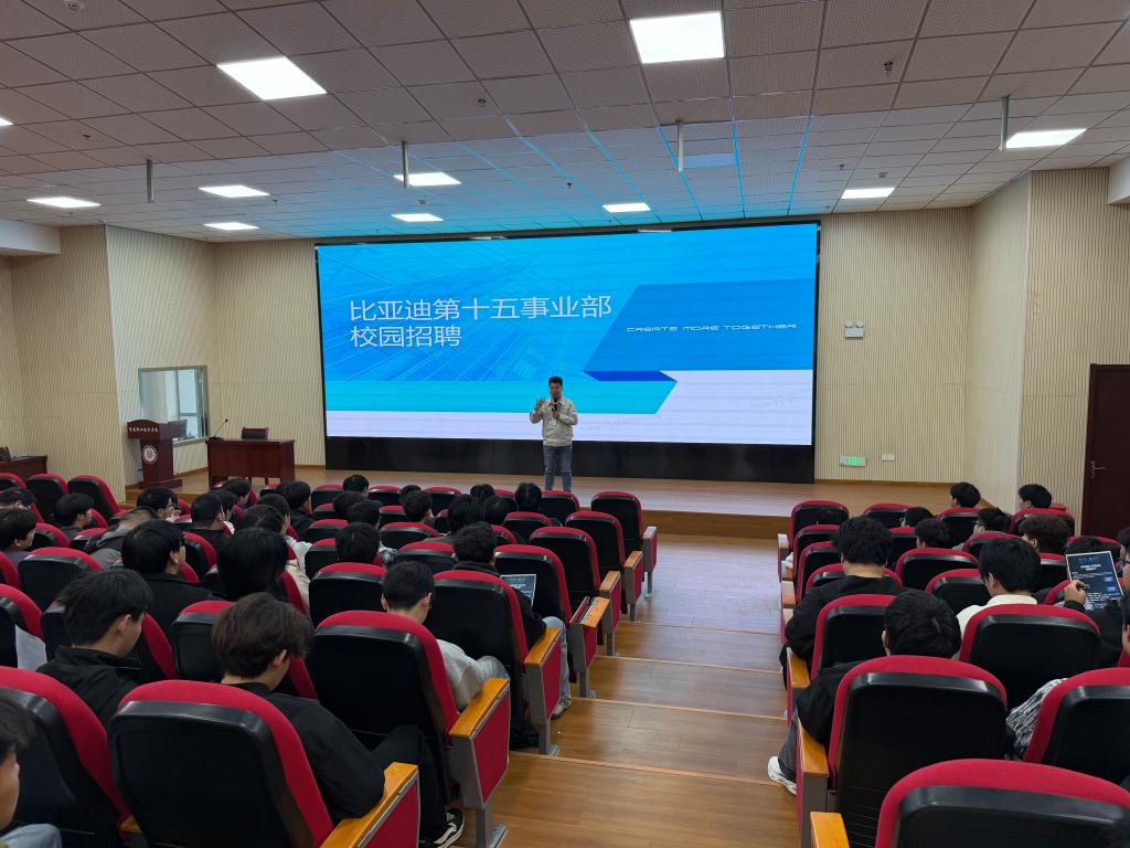 为深化产教融合、拓宽学生实习就业渠道,精准对接企业人才需求,2026年4月22日,机电学院在春申湖校区西1307教室举办专场招聘宣讲会。本次宣讲会邀请到比亚迪股份有限公司、浙江朝晖过滤技术股份有限公司两家优质企业到场,面向2024级新能源汽车专业、机电类专业学生开展招聘宣讲。
